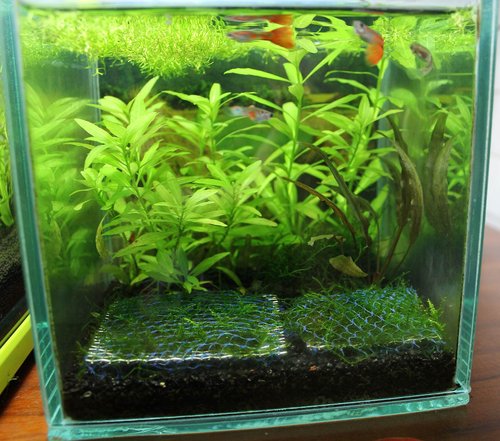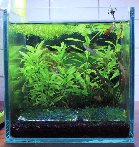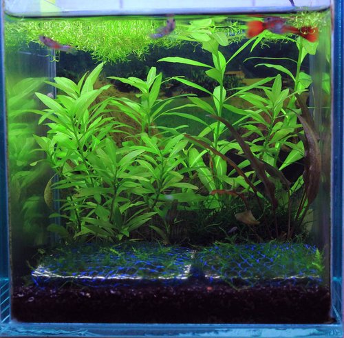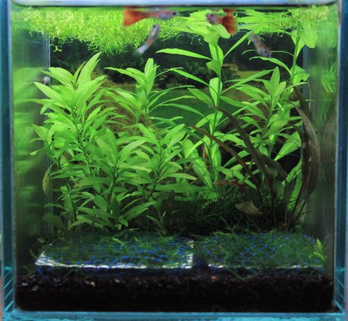 從上一次的模樣到現在,總共歷時3個月。前景改用三角莫斯,鹿角苔則漂浮在水面。另外還發現了一個恐怖的現象,我發現總是有壁虎爬在缸子側邊虎視眈眈地望著裡面的孔雀魚,真的是太可怕了。小弟不才,不太會拍照以致每張照片看起來色差不大相同,請大家多包容一下吧