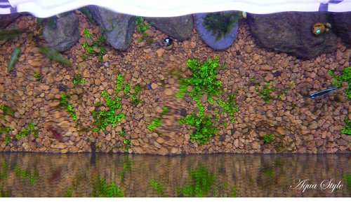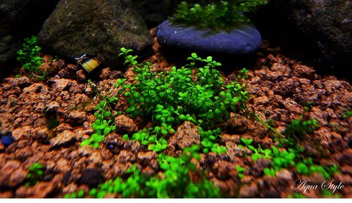 事先說明一下缸內並沒放置基肥或根肥,土則是赤玉土,從買來5*5 cm 小小一個鐵片的迷你矮,一開始先是整片放在水裡一兩天,而後變成一小撮一小撮的方式植入土中。起初表現還真的不盡理想,葉子開始縮小變黑;不過在我增強CO2卻恢復了生機,網路上所說的重CO2看來確有其事,CO2為DIY小蘇打加檸檬酸,不過其量只是靠感覺在控制,可以肯定的是遠小於1秒一顆泡(由水族所販售的細化器所打出)。