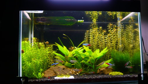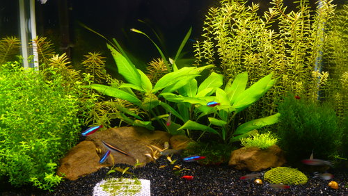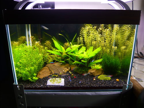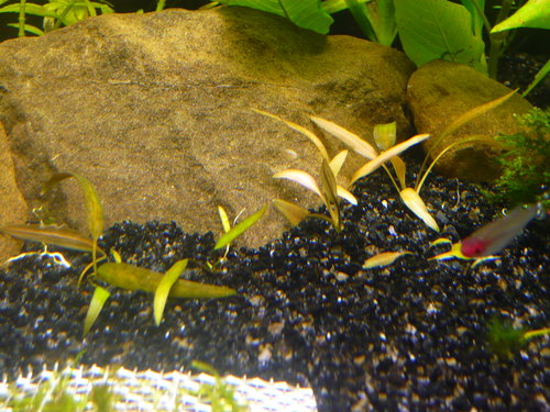 ,右後方的宮廷草也快頂水了,可能會拔起來重新種植或存粹剪頭(想來就好累@@),同時把其他魚缸的水蘭和羽毛草拿來培養,在另一個缸子的水草狀況似乎都不怎麼好,推斷與光源有很大關係!水八角成長速度真的是頗慢,不過很期待它成景後的樣子(希望屆時能整株紅通通