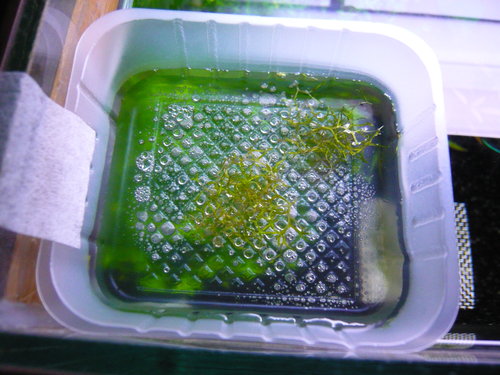 裝著蛋糕的小盒子,拿來用膠布黏在缸子一側培養飄浮起來的鹿角苔,等到量多一點再來綁到石頭上。