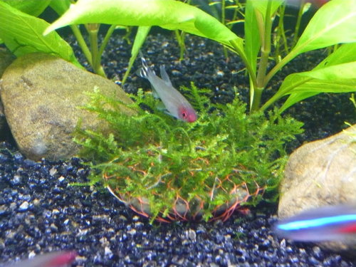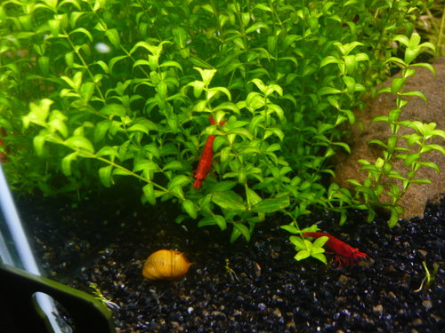 不禁要說可憐的玫瑰蝦,曾經在缸內看到斷頭的蝦子,紅通通的身體還挺挺的站在原地不動,頭卻被刻掉了,從原本20幾隻剩下個位數成蝦,再加上不知出生到第幾代的小蝦容筆者再次提醒:養紅鼻剪刀真的得注意它嘴殘的個性,水草種密意點等。既然養了就請好好愛護,目前缸內的搶食狀況都十分良好,為一隻可能之前關燈受到驚嚇,加上筆者粗心大意導致跳缸(陣亡)。