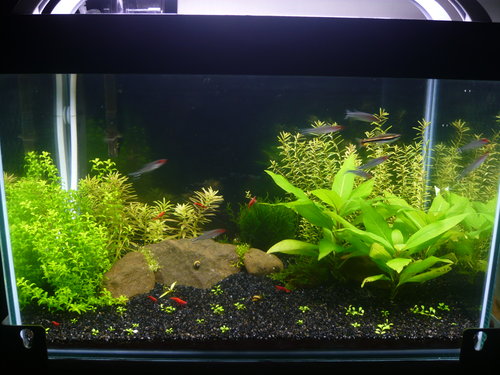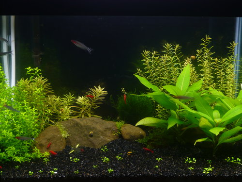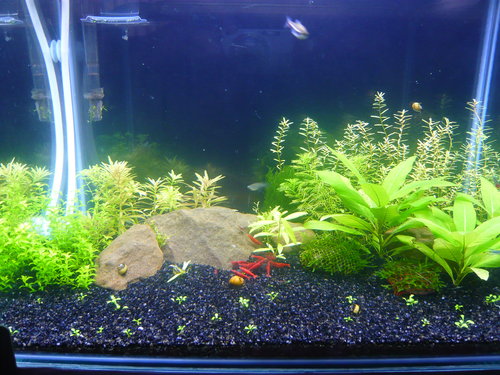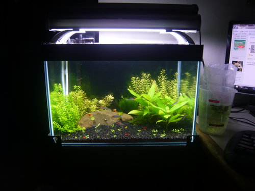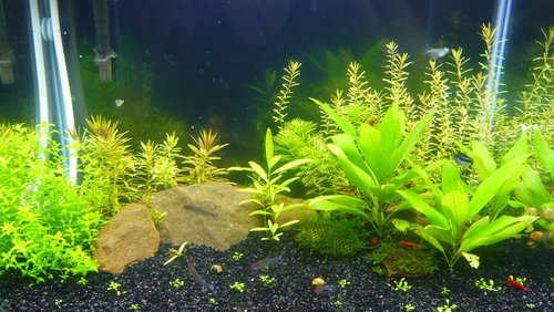 已經約兩個月沒更新這個缸子的狀況了,目前缸內狀況就如上圖所示。以珍珠草和紅宮廷來說均已修剪多次,鹿角苔也從石縫裡飄起來了幾次,火焰莫斯從原本一顆剪掉又再綁了一顆。水八角和矮珍珠則成長換慢,中柳的老葉則多有破損(可能缺乏CO2之故,有時有開CO2有時沒)。同時筆者也把青葉草和羽毛草從缸內移除,三角莫斯位置做了點小變更。大致情況就如上述,剩下部分就來賞圖唄!