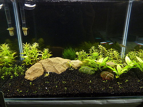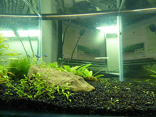 ,中柳葉片上好像都卡了點藻類,缸壁更是明顯。這次只是想看營養液到底有沒有效用,排除藻類不談,看到植物如此健康成長,成果還頗令我滿意。之後添加量再調低,再靠著2隻辛勤的蜜蜂腳螺應該可以讓缸子看起來更清潔(只是最近他們好像長黏在一
