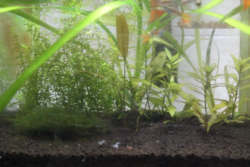 上圖大概是1個禮拜沒清理就變這樣了,似乎可以看出土壤挺肥沃的事實,加上沒打二氧化碳,透過光照使得藻類叢生。 用海棉擦拭後看起來清爽多了。 卡了一堆藻類的莫絲,似乎跟絲髮藻不同,都一坨一坨得很好夾掉(只是夾不完)。 從目前狀況看來,沒有CO2的狀況下,一般認為需要CO2的珍珠草也能生長,但葉形偏小,生長緩慢,老葉顏色偏黑(可能是卡藻)失去原有翠綠的旺盛感。之後考慮在前景添加牛毛氈讓它有更自然的風味。