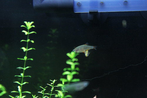 自從之前放魚後,又過了幾個禮拜,現在魚隻都很穩定,發色也更為艷麗。這次,要與大家分享的是火翅金鑽,自從牠在水族界出現,馬上吸引了許多水族玩家的目光,火焰般的魚鰭,還有身上鑽石般的斑點,在在顯示了牠亮麗的身分。據我所知,該魚的原產地已將之列為保育,禁止再捕撈,我猜現在出現在水族館的應該是人工飼養的成分較大。當然自我注意到這種魚的存在後也很心動,相較過去,現在的價格親民了許多,二話不說馬上挑了在水族店待了一段日子的火翅金鑽回家