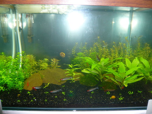 剛入缸還在適應,可以看出頭部的紅色都要消失了,值得一提的是紅鼻還滿容易受到驚嚇的!